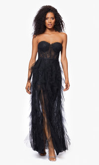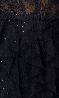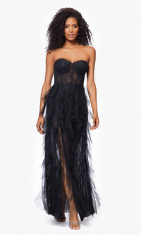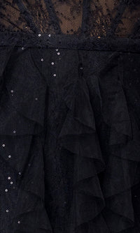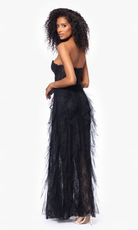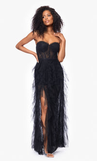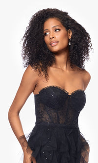 So feminine, this strapless long black lace prom dress by Betsy and Adam is as figure flattering as it is flirty. With a sheer lace corset that wraps around to the back, this long black formal dress has a ruffle-trimmed sweetheart neckline and scattered sequins for extra sparkle. The long black lace evening gown has a long skirt with corkscrew ruffles and a thigh-high side slit that adds to the sultry allure. So chic for prom, galas, and other formal events, this strapless long black lace prom dress is for the girl who knows how to make an entrance.