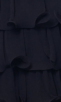Sleeveless long black formal dress with a v-neckline and a tiered rolled-hemline a-line skirt.
