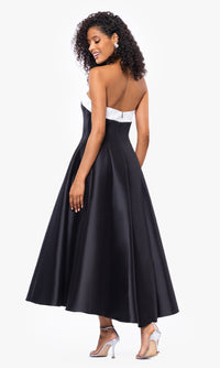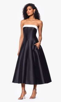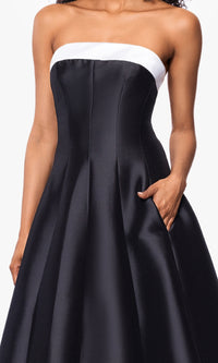 Chic and elegant this black and white formal dress flows to a flattering tea length. A white band wraps around the straight neckline of this strapless formal dress. In a lustrous mikado fabric, this a-line formal dress is snug in the bodice and flares out from the natural waistline for a flattering silhouette. Adding a convenient touch to this tea-length mikado formal dress, pockets are perfect for keeping your essentials close at hand. Ideal for a variety of special occasions, this white and black formal address is both versatile and sophisticated.