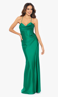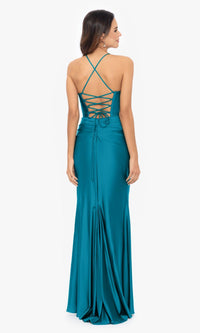 In vibrant green, this beautiful long prom dress is as shape-enhancing as it is stylish. With a corset-style bodice, this long teal sweetheart evening gown has a draped cowl-neck feature and thin shoulder straps that cross over the open back before lacing up for a comfy fit. From Betsy and Adam, this long teal blue formal dress has a long skirt that hugs the hips before flowing to the floor to complete the look. So pretty for prom, galas, and other formal events, this long teal prom dress is a contemporary style with impressive details.