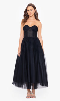 So chic, this strapless black tea length wedding-guest dress is an obvious must-have for the girl who loves a bold, yet feminine look. With a corset-style bodice that wraps around to the back, this sweetheart semi-formal dress is a modern version of a vintage design. The black midi dress has a fully-lined skirt with a sheer tulle overlay that flows to a stylish tea length in a figure-flattering a-line shape. A head-turning look for prom, weddings, and other semi-formal events, this strapless black tea length wedding-guest dress is sure to be a favorite for the season.