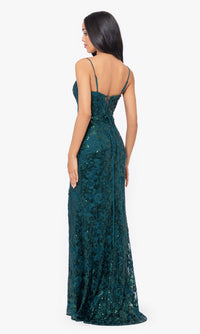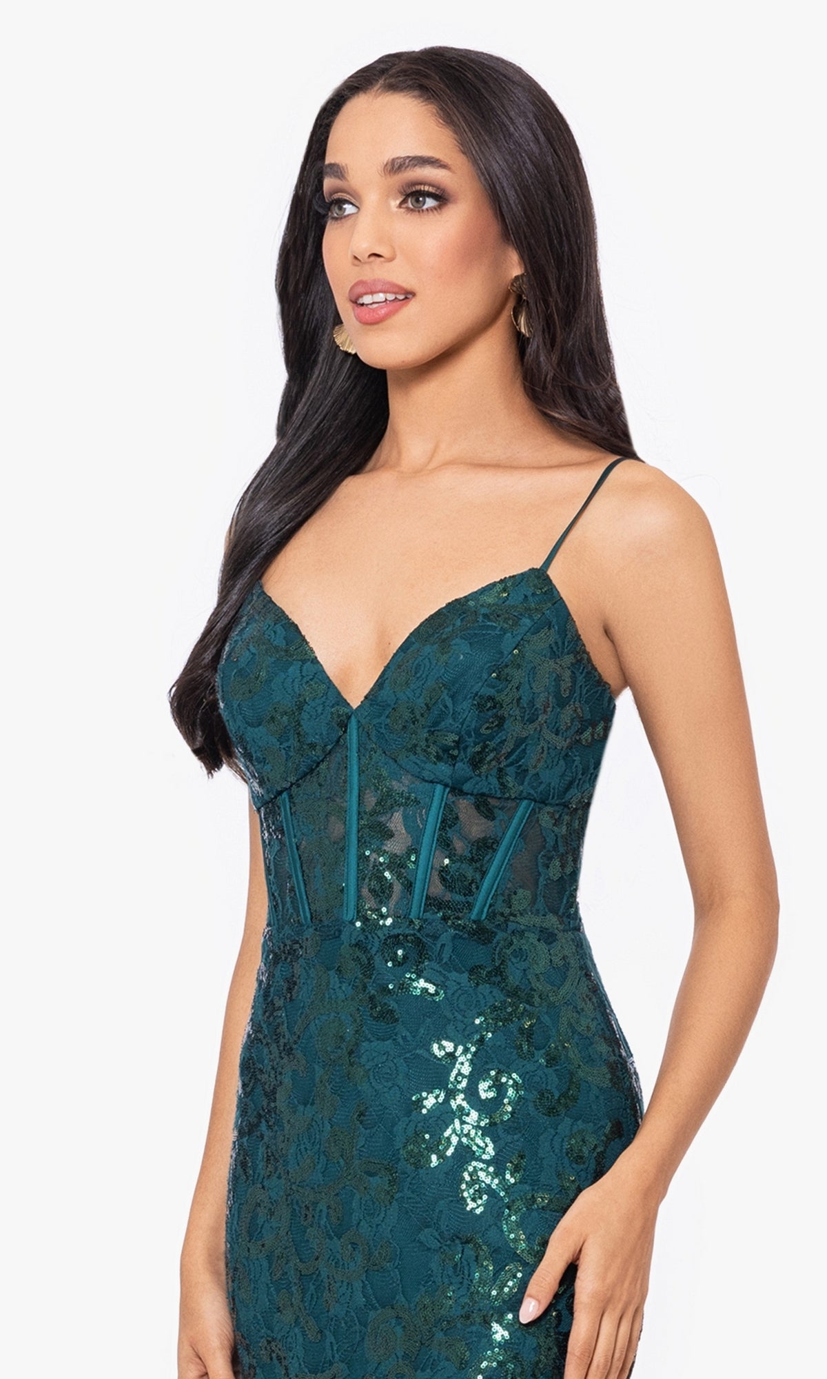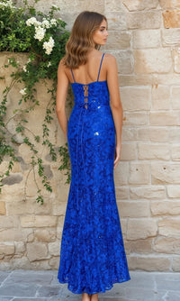 So richly designed, this sequin-lace long prom dress 4521BN is as spectacular as it is budget-friendly. For under $200, you can have this long formal dress that shimmers in dazzling sequin-lace from the v-neckline to the floor. The sequin-lace long evening gown features a sheer-lace bodice that wraps around to the lace-up back, while the hip-hugging long skirt opens in a side slit before draping to the floor. Offered in junior sizes, this sequin-lace long prom dress from Blondie Nites is nothing short of fabulous for prom, galas, and other black-tie formal events.