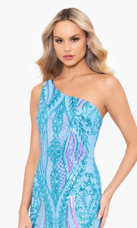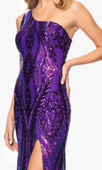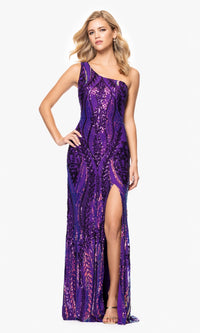 A sparkly sequin print makes this one-shoulder long prom dress 4610BN a dazzling choice for your big celebration. With a shimmering sequin print from the asymmetrical neckline to the hem, this one-shoulder evening gown from Blondie Nites shimmers with every move you make at prom, galas, and other black-tie events. In junior sizes, this long sequin-print formal dress has a slash-style back cut out that laces up for an eye-catching look. The long skirt opens in a side slit to complete the look of this one-shoulder long sequin-print prom dress that will have you checking out your reflection all night long.