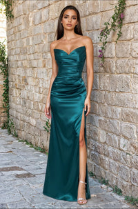 Simple, yet glamorous, this strapless sweetheart long prom dress by Blondie Nites is a classic style for your big night. With ruching from the sweetheart neckline to the hips, this strapless long formal dress offers a figure-flattering look for prom, galas, and other black-tie events. In junior sizes, this strapless long evening gown has a floor-length skirt with tummy-camouflaging ruching and a thigh-high side slit that offers a flirty look. Affordably priced under $150, this strapless long prom dress is an upscale choice for your big night that won't break the bank.