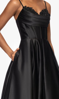 Long a-line prom dress with a corset bodice, lace applique along the sweetheart neckline, a lace-up back, and pockets.