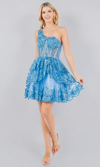 Indulge in sultry allure in this beautiful one-shoulder short homecoming dress 5132J from Cinderella Couture. As sparkly as it is sexy, this one-shoulder semi-formal dress has shimmering sequins from the asymmetrical neckline to the hem. A sheer corset-style waist offers a peek-a-boo look, while the single shoulder strap splits into two thin bands that flow diagonally over the open back of this short tiered party dress for an eye-catching look at homecoming, sweet-16 parties, and wedding receptions. In misses and some plus sizes, this one-shoulder semi-formal dress has a fully-lined short sequin-lace skirt that flows to the scalloped hemline in ruffled tiers. Budget-priced under $100, this fabulous one-shoulder short homecoming dress is sure to kick up the wow factor without emptying your bank account.