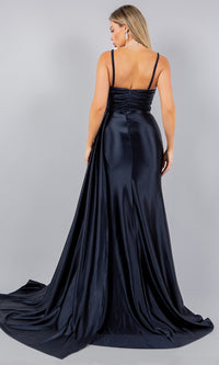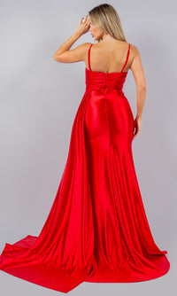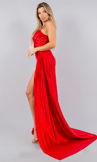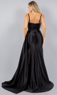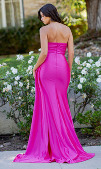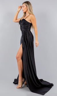 One-of-a-kind, this strapless satin prom dress is ready to turn heads at your next formal event. Sparkling with beading and sequins, the top of the sweetheart neckline on this long prom dress peeks out above beautifully pleated lux satin. A side sash on this tight prom dress drapes across the high slit of the ruched skirt. If you prefer, removable straps can be added to this strapless prom dress for additional support. For a unique and sexy style at your next fancy occasion, wear this pleated and ruched prom dress.