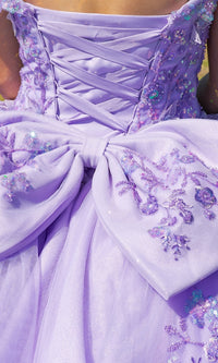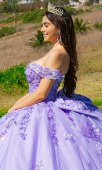 Lilac off the shoulder quinceanera ball gown with 3D floral applique detail and lace up back