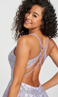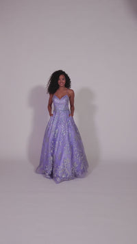 From Colette for Mon Cheri, this violet purple prom dress sparkles with a stunning silver glitter print. The gorgeous silver glitter embellishments on this prom ball gown pop with sparkling sequin accents. The v-neck bodice of this glitter prom dress features multiple beaded straps and sheer straps across the open back. Pockets in the full ball-gown-style skirt are a trendy, convenient addition to this purple prom dress. Ideal for formal dances, this open-back violet prom dress with sequins and silver glitter is sure to have you shining as you make your grand entrance.