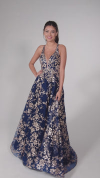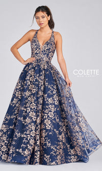 This navy blue and gold prom dress by Colette from Mon Cheri is absolutely regal. Layered with tulle, lace, and cracked ice fabric, this blue designer prom gown features a shimmering gold sequin and glitter print???that swirls from the v-neckline to the hem. Supported by an illusion inset, the v-neckline plunges to the waist of this glitter prom dress. An adjustable lace-up tie criss crosses against the open back of this lace and tulle prom dress. Perfect for formal dances, this navy blue and gold prom dress will have you sparkling under the spotlights.