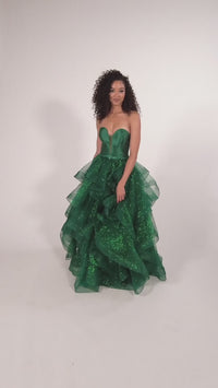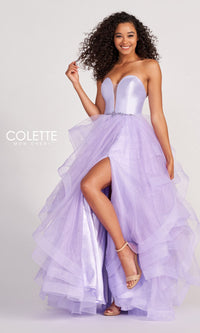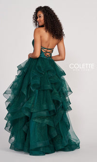 Be sensational in this glitter-tulle long layered prom ball gown. The super-sparkly strapless formal dress has a totally unique a-line skirt that is crafted in layers of glitter tulle from the beaded waist to the floor. With a sheer insert at the plunging v-neckline, this layered evening gown gets a fitted look with a back corset that laces up for a comfortable fit. From Colette for Mon Cheri, this long designer dress, style number CL2006, has a ball-gown feel for prom, weddings, and other formal events. A radiant look for your formal event, this glitter-tulle long layered prom ball gown is fresh and flirty with lots of eye-catching sparkle.