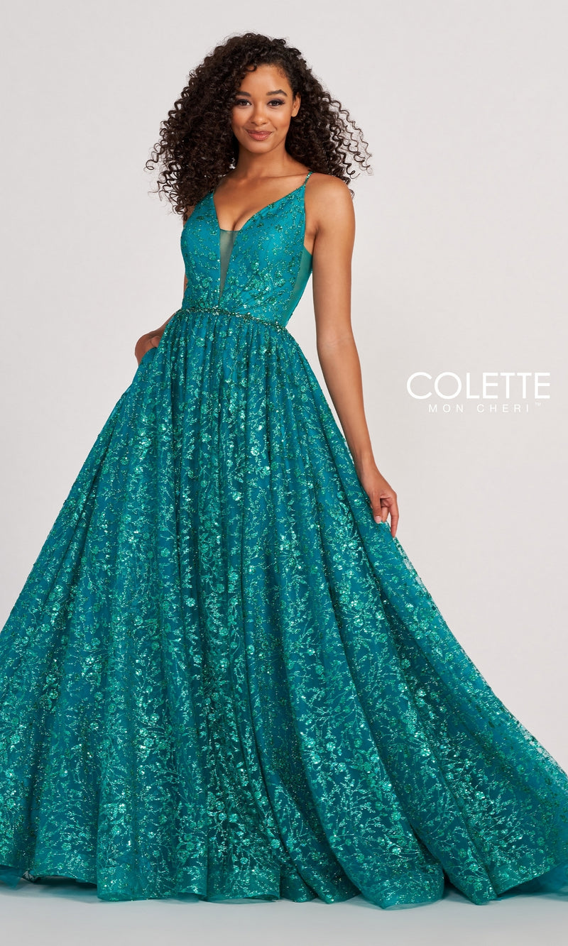 A prom ball gown with razzle dazzle, this Colette by Daphne tulle prom dress shimmers with a floral glitter print. Glimmering beads along the spaghetti straps and waistline level up the sparkle factor of this glitter prom dress. Along with the open back, illusion insets at the plunging v-neckline and sides add a sultry detail to this sheer prom dress. A spotlight-worthy design, this backless glitter prom dress is a glamorous style for formal events.