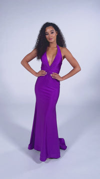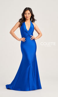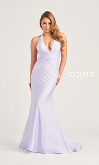Super stretchy, this long halter prom dress CL5199 enhances the curves in stretch spandex jersey. The curve-hugging long designer dress from Colette by Daphne has a halter bodice with a deep v-neckline and starburst-style front-knot detail for a contemporary look. The halter straps attach at the back of the neck and side bands tie into a bow that hangs down over the back of this fabulous long formal dress. A sophisticated style for prom, galas, and other formal events, this figure-flattering long halter prom dress is offered in misses and plus sizes.