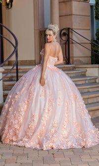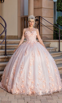 Peach pastel pink quinceanera ball gown with sweetheart strapless neckline.