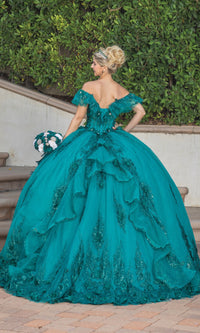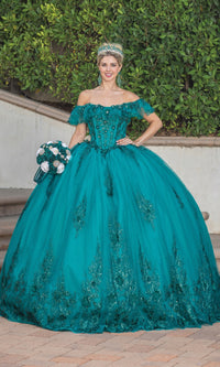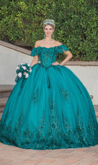 Teal green a-line quinceanera ball gown with off the shoulder straps.