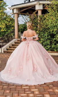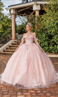 Long pastel a-line quinceanera ball gown with sweetheart neckline and off the shoulder straps.