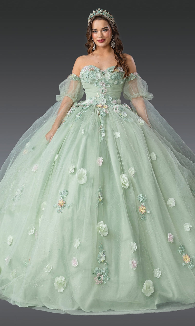Sage green quinceanera dress with 3D flowers, puff sleeves, a bow on the back, and a ball gown skirt.