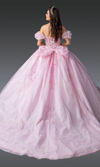 Lace embroidered quinceanera ball gown with ruffle off-the-shoulder straps, a corset bodice that ties in back, allover glitter, and a statement bow in back.