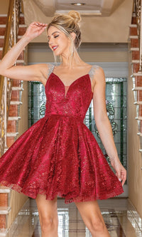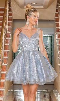 With glitter embellishments, this short homecoming dress is a dazzling style for your semi-formal event. The adorable short party dress features a sheer inset at the v-neckline and at the sides for an alluring vibe at homecoming, sweet-16 parties, and other semi-formal events. The multi-layered short babydoll skirt is a figure-flattering detail on this fabulous semi-formal dress. Offered in misses and plus sizes, this short glitter homecoming dress is perfect for the girl who loves the spotlight.