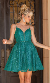 Adorned with shimmering embellishments, this short emerald green homecoming dress is as sparkly as it is stylish. With a swirling sequin print from the plunging v-neckline to the hem of this short emerald green semi-formal dress, a sparkly look is yours at homecoming, sweet-16 parties, and other fancy events. Offered in misses and some plus sizes, this emerald green party dress has thin shoulder straps that lead to the thin bands that lace up over the open back, while the short skirt gathers at the beaded waist before angling away from the hips to the hem in an a-line shape. Affordably priced under $100, this short emerald green homecoming dress is a great find for the savvy girl who loves green and who loves a bargain.