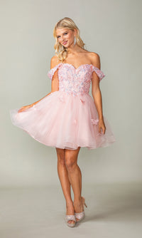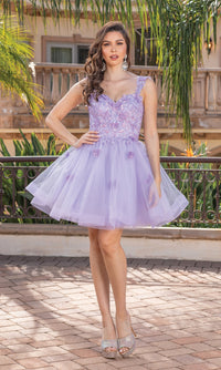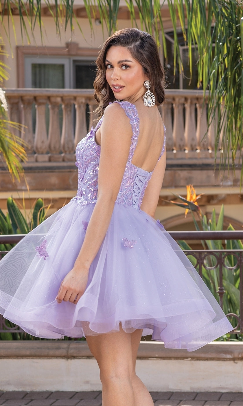 Draw admiring eyes in this short a-line homecoming dress 3338 from Dancing Queen. With a gleaming embroidered-lace bodice, this short babydoll party dress has embellished shoulder straps that lead to the corset-style bands that lace up for the best fit at homecoming, sweet-16 parties, and other fancy events. In misses and some plus sizes, this short semi-formal dress has matching embroidered-lace details on the fully-lined short babydoll skirt that flows to the hem in a fabulous a-line shape. Affordably priced under $150, this short a-line homecoming dress is a great find for the girl who loves to be the center of attention.