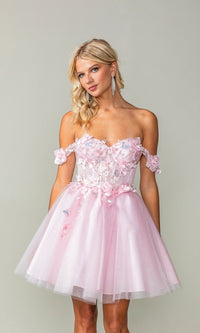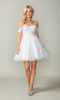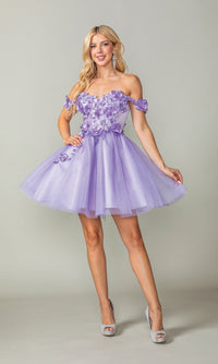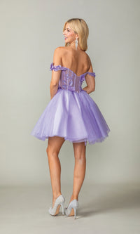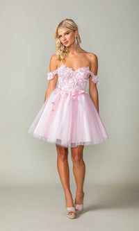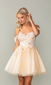 Stand out in this gorgeous off-the-shoulder short babydoll homecoming dress 3388 from Dancing Queen. With 3-D floral details on the sheer corset-style bodice, this off-the-shoulder short party dress has banded sleeves that drape romantically over the upper arms, while thin bands lace up over the open back for a flirty look at homecoming, sweet-16 parties, and other semi-formal events. In misses and some plus sizes, this short babydoll cocktail dress has a fully-lined skirt with a sheer glitter overlay that flows to the hem in a flattering a-line shape. Budget priced under $150, this adorable off-the-shoulder short babydoll homecoming dress is a tantalizing symphony of cuteness and sensual details.