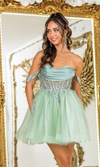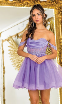 Sweet and sassy, this off-the-shoulder short babydoll prom dress by Dancing Queen is a celebration of delightful style. With a sheer corset that wraps around to the lace-up back, this cute short cocktail dress gets a sexy vibe for prom, sweet-16 parties, and other semi-formal events. The sweetheart short cocktail dress has embellished banded sleeves that drape alluringly over the upper arms, while the short skirt flows to the hem in an a-line shape. Offered in misses and some plus sizes, this adorable short babydoll prom dress is surprisingly affordable, at under $150.