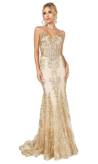 Here's a sparkly long beaded prom dress that raises the style bar. The sensational formal dress features sequins and beads in a shimmering pattern from v-neckline to hem. This fabulous evening gown has a sheer corset-style bodice with a v-neckline, structured boning, and thin shoulder straps that lead to the v-back. With a dramatic train, this gorgeous beaded dress has a mermaid skirt that smooths over the hips before draping to the floor in layers. For the girl with a flair for fashion, this long sparkly prom dress is sure to make an unforgettable statement at formal events.