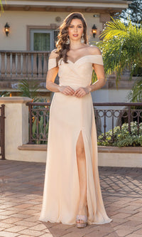 If you're in need of a classic formal prom dress, then your search is over. This off-the-shoulder prom dress offers a timeless Old Hollywood vibe with a dash of modern style. A subtle v-neckline accents the bodice of this long prom dress. Off-the-shoulder bands wrap around the arms and create a crossover detail on the bodice, just above a flattering pleated design. A sassy side slit rounds out the beautiful styling of this v-neck classic prom dress.