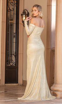 | Details: | Long Sleeves, Off-the-Shoulder, Ruching, Side Slit, Shimmer Please Note: There may be a loss of glitter while wearing this dress due to the nature of the fabric. |