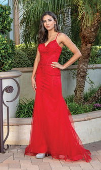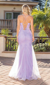 Beautifully feminine, this glitter prom dress has 3-D floral appliques and delicate beadwork that trail from the v-neckline down to the skirt. The embellished sheer overlay of this tight prom dress hugs the curves through the hips before flaring away from the glittery lining and ending in a horsehair hemline. Spaghetti straps criss cross against the open back of this v-neck prom dress to create an adjustable corset detail. A gorgeous design for formal celebrations, this shimmer prom dress with beaded floral appliques is sure to please.