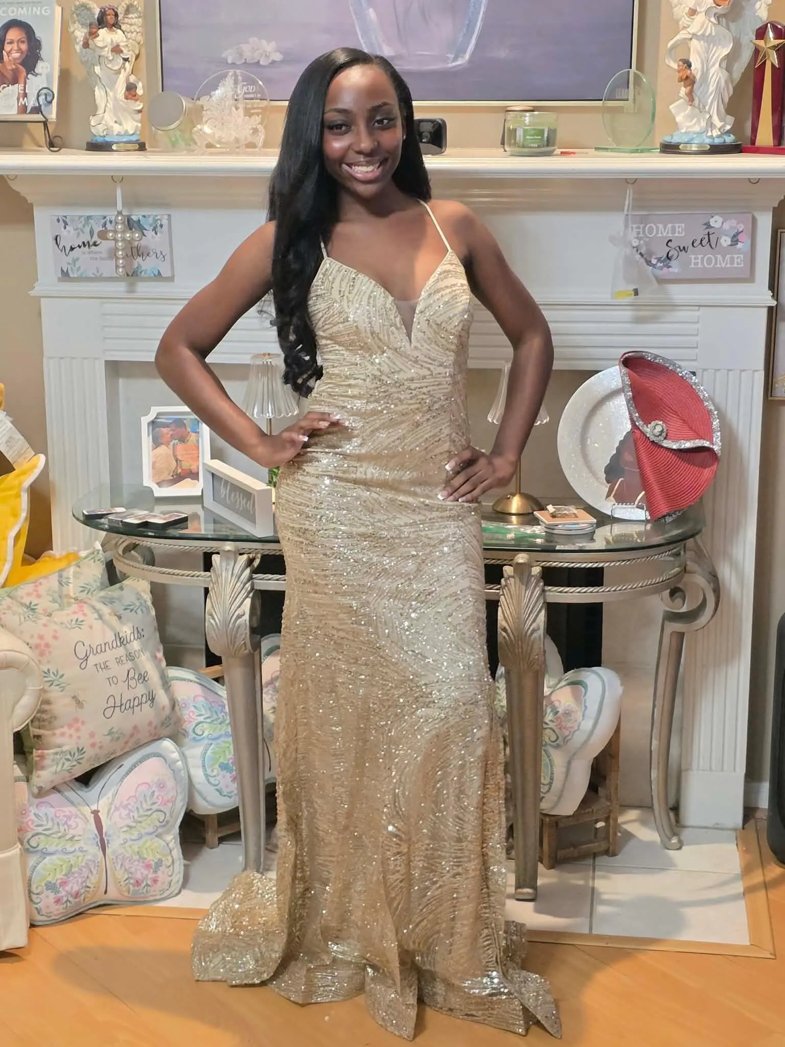 A woman poses outdoors on a patio with plants and a balcony, wearing the Strappy-Back Long Sequin Prom Dress—a sparkly gold gown featuring thin straps and an open back.