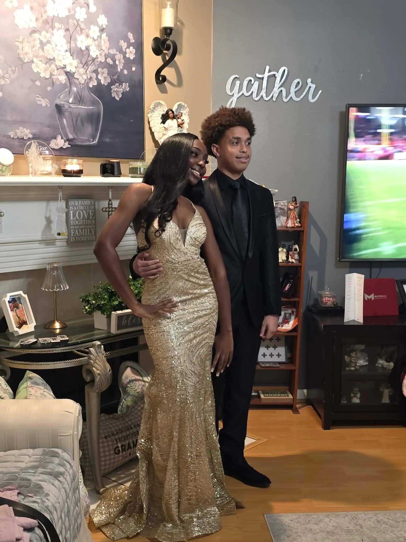 Details: Horsehair Hem, Illusion Inset, Open Back, Sequin & Glitter Print