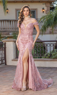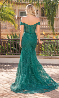 Honor the curves in this off-the-shoulder long formal prom dress that will not go unnoticed. With a sheer inset at the plunging v-neckline, this long formal dress gets a sexy vibe, while off-the-shoulder banded sleeves add a look of romance for prom, galas, and other black-tie events. The off-the-shoulder evening gown has sparkly embroidered designs that flow from the corset bodice to the hem, while the fully-lined long skirt opens in a side slit before reaching the floor. Standout in a crowd in this captivating off-the-shoulder long formal prom dress that lets you strike an elegant pose while sparkling under the lights.