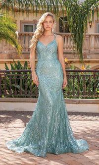 This dazzling long glitter formal prom dress shines for an exciting look at your memorable event. Whether you're going to prom, a fancy gala, or another formal event, this shimmering long mermaid dress sparkles with a glitter print from the deep v-neckline to the hem. The glitter-print formal dress has a sheer inset at the plunging v-neckline, and doubled thin shoulder straps that shine as they attach to the corset detail that laces up for the best fit. The fully-lined hip-skimming mermaid skirt has a sheer glitter-print overlay that flows to the floor with a dramatic flourish that completes the design. Affordably priced under $200, this long glitter formal prom dress showcases the curves with captivating style.