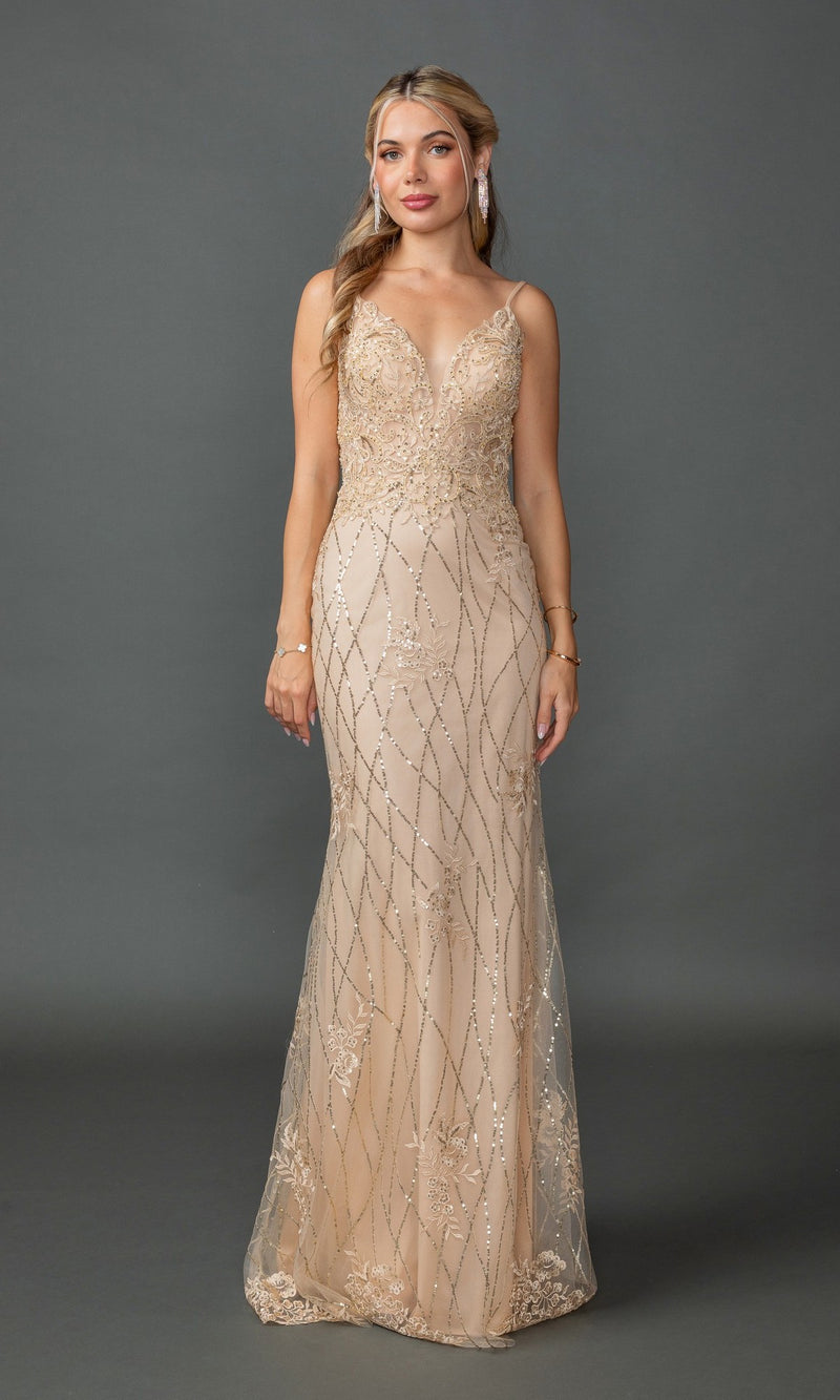 A woman poses against a gray background, wearing the Sequin-Print Long Prom Dress Dancing Queen 4371 in champagne—a sleeveless, floor-length gown with intricate beadwork and a fitted silhouette.