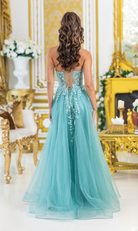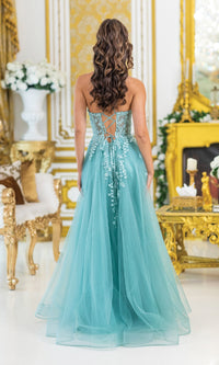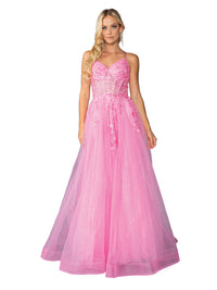 Big, bold, and beautiful, this long tulle prom ball gown is simply gorgeous for prom, galas, and other black-tie events. Offered in misses and some plus sizes, this long formal dress from Dancing Queen gets a sexy upgrade with a sheer embroidered bodice that wraps around to the back. The eye-catching long evening gown has thin shoulder straps that criss cross the open back before thin bands lace up for the best fit. Matching embroidery flows past the waist and onto the multi-layered long a-line skirt that cascades to the floor to complete the look of this gorgeous long tulle prom ball gown that is sure to make you the belle of the ball.
