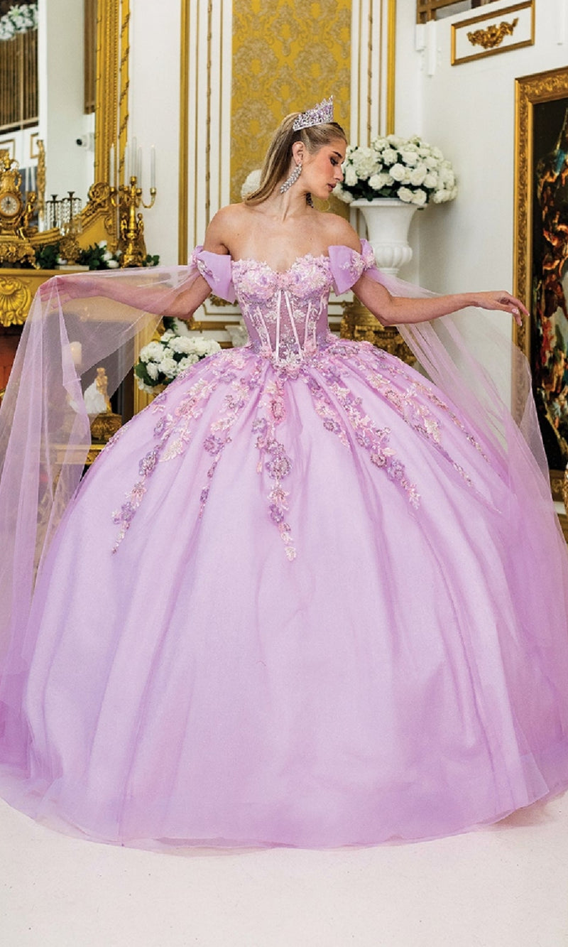 Blush pink quinceanera ball gown with floral embroidery, bows on the off-the-shoulder straps that then flow into whimsical sheer tulle pieces that go down to the floor. This quinceanera dress also has a corset bodice that laces up in back.