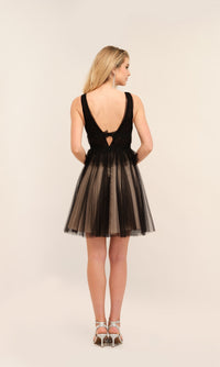 From Dave and Johnny, this stylish short black tulle homecoming dress is first class. With a nude lining, this exciting short black designer dress has black tulle from the deep v-neckline to the hem for a touch of intrigue that guides the eyes at homecoming, wedding receptions, and other semi-formal events. In misses and some plus sizes, this short black party dress has beaded designs that wrap around the empire-waist, while a peplum-topped short a-line skirt completes the design. The epitome of modern glamour, this short black homecoming dress is sure to steal the show.