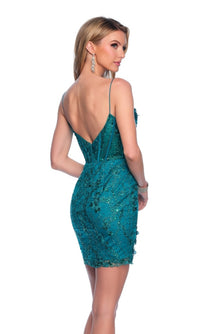 Elevate your allure in this short teal glitter homecoming dress 11924 from Dave & Johnny. With embroidered-lace from the plunging v-neckline to the hem, this short teal designer dress has scattered sequins and glittery designs for a sparkly look at homecoming, wedding receptions, and other semi-formal events. The short teal party dress has a corset-bodice that wraps around to the deep v-back, while the short mini skirt ends in a side slit. You won't be able to take your eyes off of your reflection when you choose to slip into this short teal glitter homecoming dress from Dave & Johnny.
