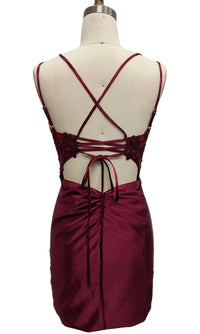 In deep burgundy red, this strappy-back short homecoming dress 12619 by Dave and Johnny is ready to make a statement. The exciting short burgundy designer dress has a sheer lace bodice with double spaghetti straps that lace up over the open back for the best fit at homecoming, weddings, and other semi-formal events. The short burgundy cocktail dress has a mini skirt with tummy-camouflaging ruching and back pleats that provide booty contouring. Showcase the curves in this red hot short burgundy red homecoming dress that combines sexy style and figure-flattering details.