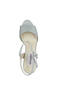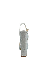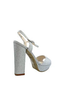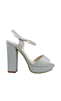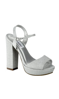 Open-toe silver glitter prom shoes with 4.5 inch block heels and buckle closures.
