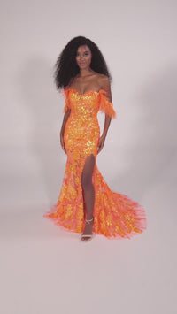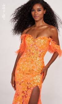 Here's a gorgeous long sequin prom dress that allows you to show a touch of skin while striking an elegant pose. From Ellie Wilde, EW34034 is a spectacular long designer dress featuring an off-the-shoulder sweetheart bodice with a sheer waist and amazing feathered bands that drape romantically over the upper arms. An open-back corset detail allows you to lace up for the best fit on this long sequin formal dress, while the long skirt has a mini lining and a side slit that will not go unnoticed. Flowing to the floor for a dramatic look, this long sequin prom dress by Ellie Wilde is offered in misses and extended sizes for the time of your life at prom, pageants, and other formal events.