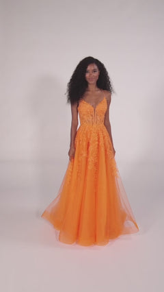 Sparkle under the lights in this long lace prom ball gown with scattered beading. From Ellie Wilde, this gorgeous long designer dress EW34036 is totally unique with a sheer corset bodice with thin shoulder straps that lead to the lace-up back. Beaded floral lace flows from the plunging v-neckline to the floor for a radiant look on this beautiful long evening gown, whether you're attending prom, a fancy gala, or another formal event. The multi-layered long skirt has a sheer beaded-lace overlay that flows to the floor in a figure-flattering a-line shape that completes the look. For freedom of movement, and a captivating look, slip into this amazing long lace prom ball gown from the designers at Ellie Wilde.