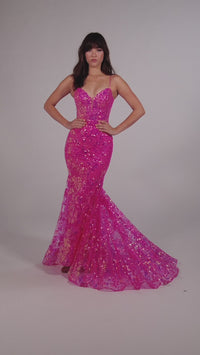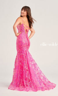 Shimmer and shine in this spectacular long designer prom dress EW35013 from Ellie Wilde. With sparkly glitter tulle and tiny sequins from the v-neckline to the hem, this dazzling long mermaid formal dress is sure to garner attention at prom, military balls, and other formal events. In misses and plus sizes, this long evening gown has thin shoulder straps that lace up over the open back for the best fit, while the fully-lined long mermaid skirt includes a sparkly sheer-tulle overlay that showcases the hips before draping to the floor. A glamorous choice for your big formal, this glitter-tulle long designer prom dress is sure to get double takes as soon as you enter the room.