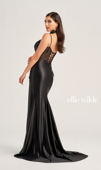 From Ellie Wilde, this long designer prom dress EW35028, is an impressive style for your big night. Whether you're attending prom, a gala, or another black-tie event, this sheer beaded-waist long formal dress is sure to draw admiring eyes. With beaded-lace floral appliques at the sweetheart neckline and at the side, this corset-back evening gown has a chic choker necklace that matches perfectly. Thin shoulder straps lead to the sheer back of this elegant long formal dress that has thin bands that lace up for the best fit. Offered in misses and some plus sizes, this long formal dress has an applique-front long skirt that opens in a side slit before ending in a small train that follows behind. Get ready to turn heads when you slip into this long designer prom dress by Ellie Wilde.