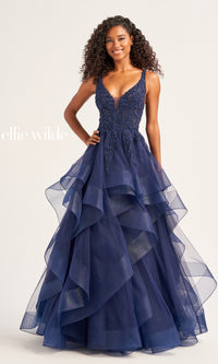 From Ellie Wilde, this long tiered a-line prom dress is well suited for your grand entrance. With a fabulous long a-line skirt with fluffy tiers, this long designer dress gets an outstanding look whether you are attending a military ball, prom, or another formal event. The gorgeous lace-bodice formal dress has a sheer waist, deep v-neckline, and thin shoulder straps that lead to the deep v-back that beautifully frames the diamond-shaped cut-out detail. Scattered beading completes the look of this long tiered a-line prom dress by Ellie Wilde that is ready to stand out at your black-tie event.