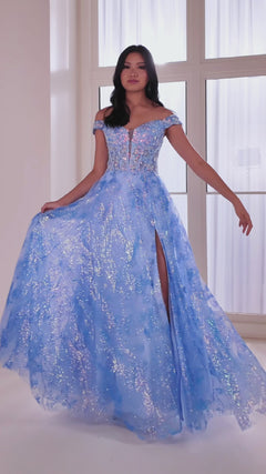 Off-the-shoulder long a-line prom dress that glows in the dark. This glow-in-the-dark prom dress also features a corset bodice, lace-up back, and a thigh-high leg slit.