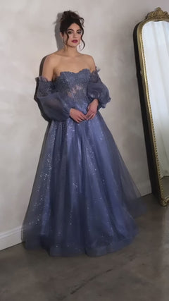 Truly romantic, this long sleeve strapless long a-line prom dress by Eureka is two gorgeous styles in one. In misses and some plus sizes, this beautiful long formal dress has off-the-shoulder sheer long puff sleeves that are easily removable for a sleeker look at prom, galas, and other black-tie events. With an embroidered sheer corset that wraps around to the back, this strapless evening gown gets a fitted look, while the fully-lined long glitter-tulle skirt flows to the floor with a flourish. An ultimate show stopper for your celebration, this long-sleeve strapless long a-line prom dress is delivered with an instant bonus with two spectacular looks in one.
