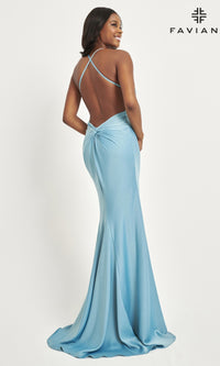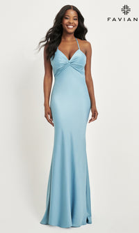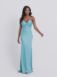 From Faviana, this long satin prom dress 11066 is as impressive as it is flattering for your big formal. Whether you are going to prom, a gala, or another black-tie event, this beautiful long satin formal dress offers a figure-flattering look that the crowd will love. Featuring a tasteful front and back knot detail, this long designer dress has a v-neck bodice with thin shoulder straps that criss-cross over the open back, while the hip-hugging long skirt flows to the floor with a mini train that follows behind. Make your way to a memorable evening when you choose this gorgeous long satin prom dress from Faviana.